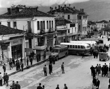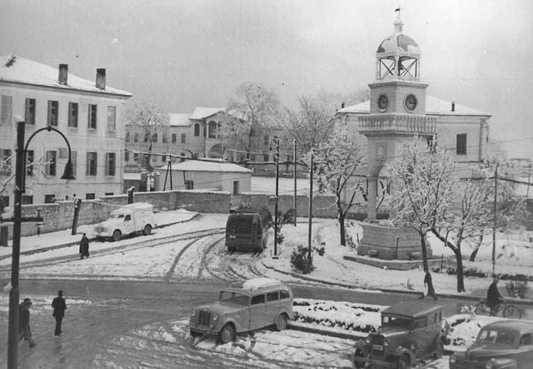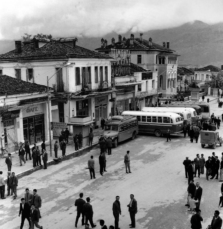Άποψη της κεντρικής πλατείας των Ιωαννίνων μπροστά από το clock house! Στα δεξιά, το δημαρχείο είναι ορατό ακριβώς όπως είναι σήμερα. Στο βάθος, διακρίνεται το όρος Μιτσικέλι. Παλιά λεωφορεία και φορτηγά της εποχής, παρκαρισμένα. Κυρίως άνδρες, ντυμένοι με κοστούμια και παλτά της συγκεκριμένης εποχής.