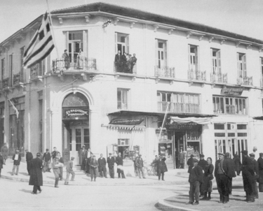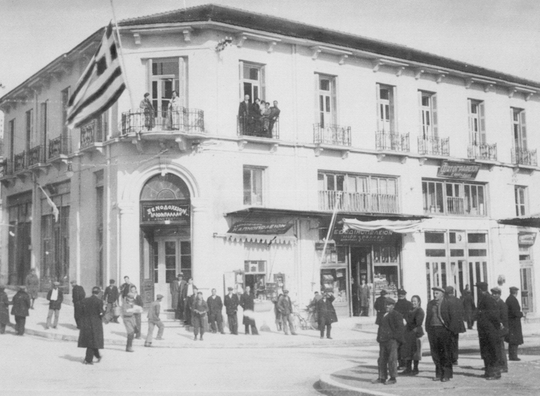 1950-1960. Δεσπόζει ακόμα στο σημείο εγκαταλελειμμένο. Επίσης απεικονίζονται με σειρά από αριστερά προς τα δεξιά ένα καπνοπωλείο, ένα εδωδιμοπωλείον (κατάστημα τροφίμων) και ένα φωτογραφείο.