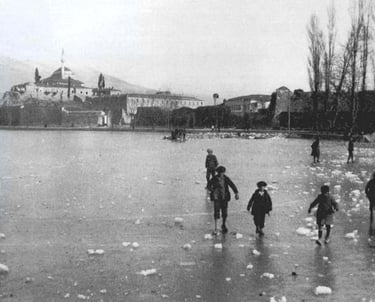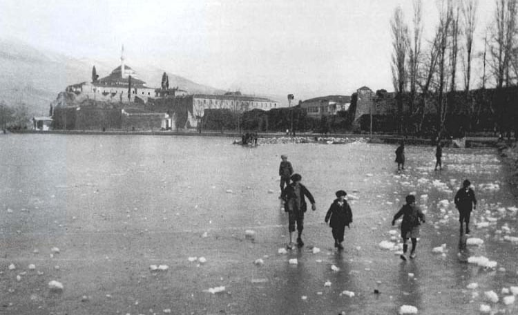 Δεκαετία του 1930. Εικόνα της παγωμένης λίμνης Παμβώτιδας με παιδιά να περπατούν πάνω της φορώντας τραγιάσκα και μακριές κάλτσες, σύμβολα της εποχής.